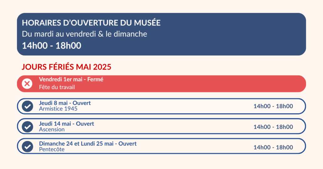 Le musée est fermé les lundis (ouvert le lundi de Pâques et le lundi de Pentecôte) et le 1er mai.